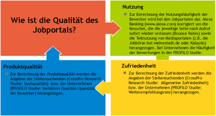 Zur Berechnung der Nutzungshäufigkeit wird sowohl bei Bewerbern als auch bei Arbeitgebern bei den Jobportalen das Alexa Ranking (www.alexa.com), korrigiert um die Besucher, die die jeweilige Seite nach Aufruf sofort wieder verlassen (Bounce Rates) sowie die Teilnutzung (mit 10% der angenommenen Gesamtnutzung) von Mediaportalen mit (z.B. die Jobbörse bei meinestadt.de oder Kalaydo) herangezogen.