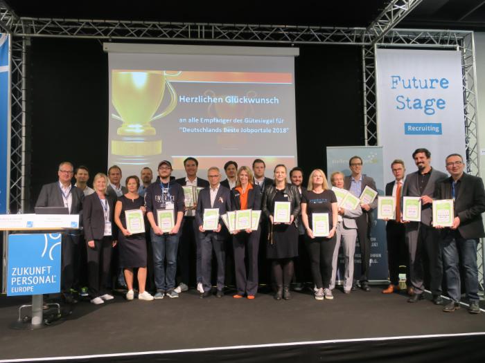 Mehr als 31.500 Bewerber und über 11.500 Arbeitgeber haben ihre Erfahrungen geteilt und damit als Jury die Basis für die renommierten Gütesiegel „Deutschlands beste Jobportale 2018“ gebildet. Auf der diesjährigen HR-Leitmesse „Zukunft Personal Europe“ in Köln wurden im Rahmen des Future of Recruiting Summits 2018 die Gewinner-Jobbörsen offiziell ausgezeichnet.