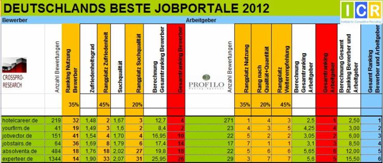 Hotelcareer konnte sich quasi in einem Fotofinish den ersten Platz vor YourFirm sichern. Bei den Bewerbern lag Hotelcareer noch hinter YourFirm, bei den Kriterien Suchqualität und Zufriedenheit gaben sich die beiden nichts. Auf der Arbeitgeberbeurteilung lagen die beiden auch eng beieinander, aber am Ende reichte es knapp für Hotelcareer. Jobvector, auf Platz drei, mußte in der Gesamtwertung der Bewerber einen deutlichen Abstand zu den beiden Erstplatzierten hinnehmen, bei den Arbeitgebernbewertungen brauchte sich Jobvector nicht zu verstecken. Ein zweiter Platz bei den Arbeitgebern sichert Jobvector den 3. Platz.