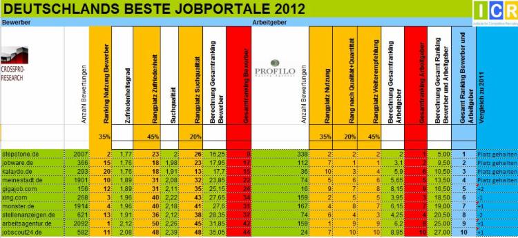 Stepstone kann sich den wieder den ersten Platz vor Jobware und Kalaydo sichern. Stepstone erfreut sich zwar dabei einer deutlich höheren Nutzung sowohl bei Arbeitgebern als auch bei Bewerbern als Jobware, muß allerdings sich allerdings bei allen anderen Kriterien (Arbeitgeberbeurteilung der Kriterien Qualität und Quantität sowie Weiterempfehlung, Bewerberbeurteilung Zufriedenheit und Suchqualität) Jobware meist knapp geschlagen geben. Kalaydo verdient sich den 3. Platz vornehmlich durch gute Beurteilungen bei der Arbeitgeberbeurteilung der Kriterien Qualität und Quantität sowie Weiterempfehlung. Hinsichtlich der Suchqualität auf Bewerberseite liegt Kalaydo sogar vor Stepstone.Jobpilot mußte die Rangliste leider verlassen, da es nicht mehr die Mindestanzahl an Bewertungen auf der Arbeitgeberseite erreicht hat.