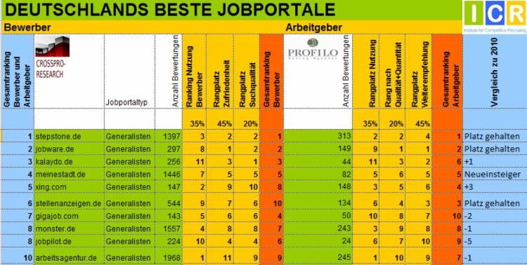 In der Gesamtauswertung der generalistischen Jobbörsen lieferten sich Stepstone und Jobware ein Kopf-an-Kopf Rennen mit einem Photofinish und einem knappen Sieg für Stepstone. Den größten Sprung nach vorne machte Xing, die sich vom vorjährigen 8.Platz auf den 5.Platz vorarbeiten konnten. Im Gegenzug mußte Jobpilot fünf Plätze abgeben und landete auf dem 8. Platz kurz vor der Arbeitsagentur. Neueinsteiger auf Platz 3 ist meinestadt. Für die Gesamtauswertung der wichtigsten Jobportale müssen diese mindesten 30 Bewertungen auf Bewerberseite und gleichzeitig mindestens 15 Bewertungen auf Arbeitgeberseite aufweisen.