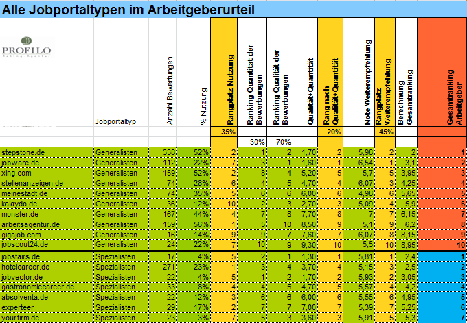 Jobstairs konnte sich bei den Spezialjobbörsen im Urteil der Arbeitgeber im Jahr 2012 den ersten Platz vor Hotelcareer, einem Neueinsteiger ím letzten Jahr, und Jobvector sichern. Hotelcareer weißt zwar höhere Nutzungsraten auf, muß sich aber sowohl bei den Kriterien Qualität und Weiterempfehlung dem Sieger Jobstairs geschlagen geben. Jobvector, in diesem Jahr neu dabei, zeigt auch bereits sehr gute Qualitäten und macht zumindest in den Kriterien Qualität und Weiterempfehlung dem zweitplazierten den Rang streitig.