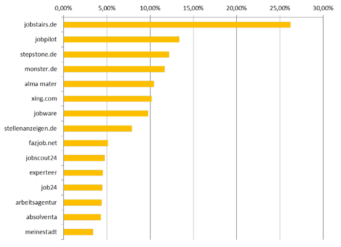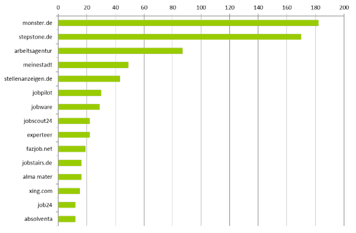 Aus dieser Grafik wird ersichtlich, daß z.B. mehr als 180 Bewerber angeben haben, daß sie für die Suche nach einer Tätigkeit im Berufsfeld Personal die Jobbörse Monster nutzen.
