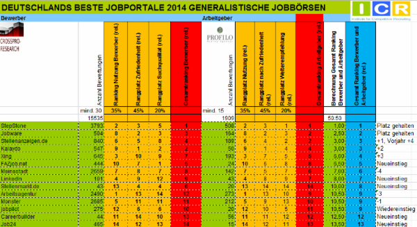 Seriensieger StepStone konnte sich auch 2014 mit einer wieder überzeugenden Leistung sowohl auf Bewerber als auch auf Arbeitgeberseite (beide Male Platz 1 in der relativen Konkurrenz) den ersten Rangplatz sichern. Direkt dahinter folgt wie auch in den letzten Jahren Jobware mit ähnlich guten Ergebnissen. Spannend wird es auf Platz drei, der dieses Jahr doppelt vergeben wurde: Stellenanzeigen.de, die sich in den letzten beiden Jahren kontinuierlich nach vorne gearbeitet haben (dieses Jahr um einen Rangplatz, letztes Jahr waren es sogar vier) teilt sich den 3. Platz mit Kalaydo, die im diesjährigen Vergleich zwei Rangplätze gut machen konnten.