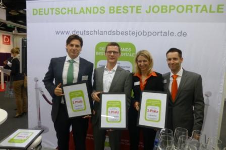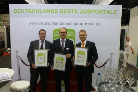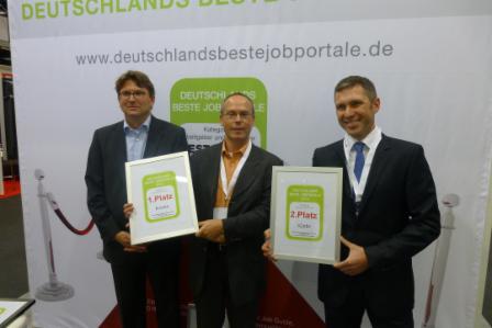 Foto: Die Preisträger in der Kategorie "Spezial-Jobbörsen", vlnr: Herr Kümmerle von Yourfirm (2.Platz), Hr. Lorenzen von Hotelcareer (1.Platz), Fr Dr. Birkmann von Jobvector (3.PLatz)
